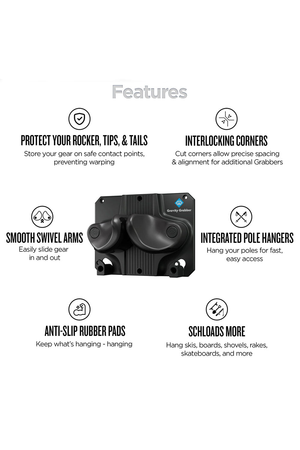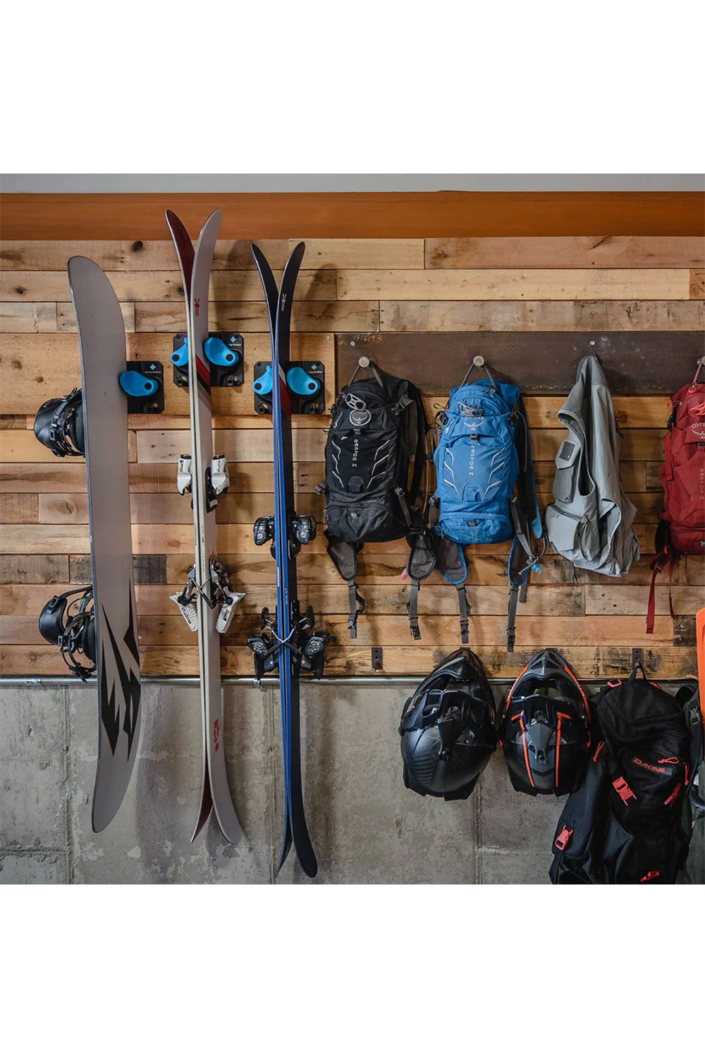 The Gravity Grabber is a versatile wall-mounted storage solution designed for skiers and snowboarders who demand better organization without compromising equipment integrity. This system accommodates both skis and snowboards simultaneously, eliminating the need for multiple storage solutions. The innovative clamping mechanism preserves the natural profile and shape of your gear—no more pinched tips or pressure marks. By keeping equipment elevated and off the ground, it prevents edge delamination, tip and tail damage, and unwanted dents that compromise performance and aesthetics. Installation is straightforward, making it accessible for users of all ages and experience levels. Built with both function and appearance in mind, the Gravity Grabber transforms cluttered garage corners into an organized, visually appealing display that protects your investment season after season.