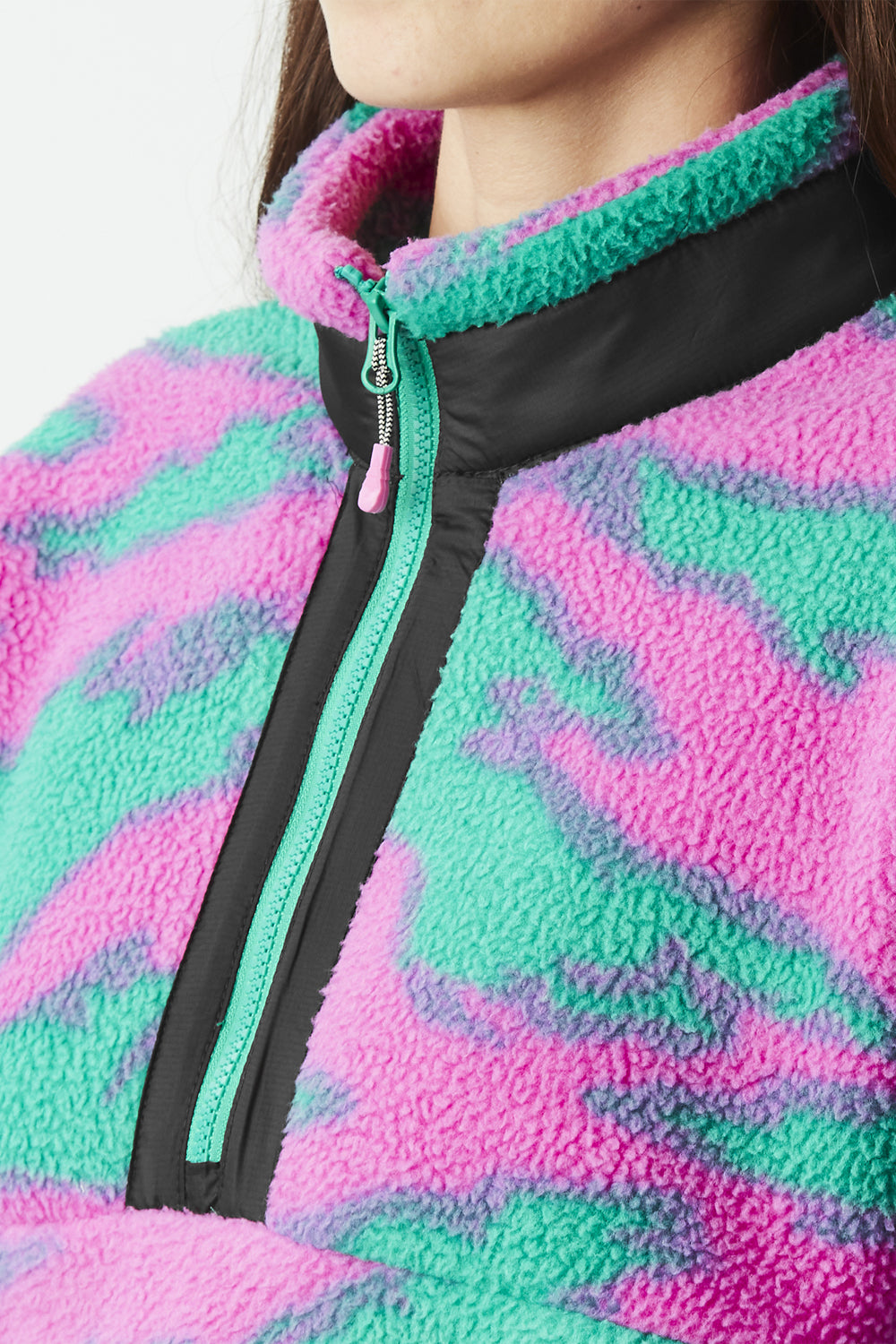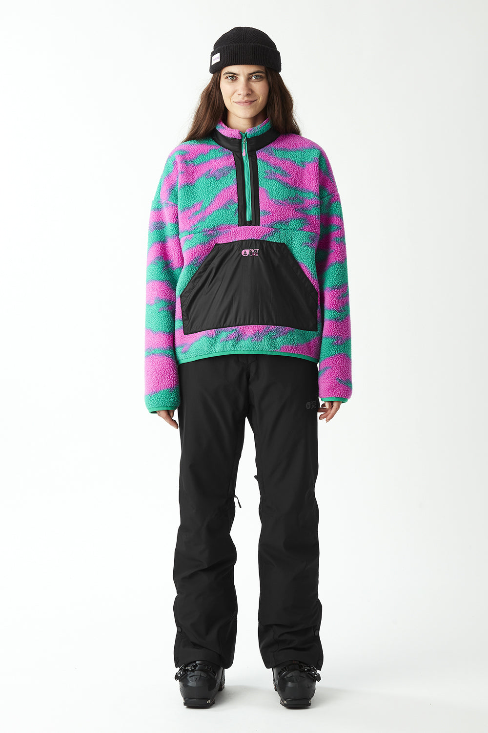 The Picture Zelkova 1/4 Print Fleece blends sustainability with performance, crafted from 100% recycled polyester Sherpa fabric. Its warm high collar and durable YKK® zipper provide reliable protection against cold, while practical pockets offer convenient storage. Ideal for both active outdoor adventures and relaxed après-ski moments, this fleece delivers comfort and eco-conscious style in every setting.